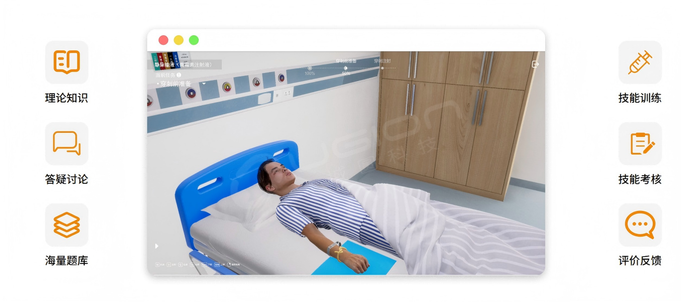 基础护理虚拟实训系统以护士职业资格考试教学内容为基础,结合VR/AR/MR等先进技术,将基础知识、实际操作与临床思维有机地结合起来。对医学护理和急救中的复杂问题和紧急问题进行模拟,并在虚拟环境中进行训练,节省成本,降低风险,提高培训效果。